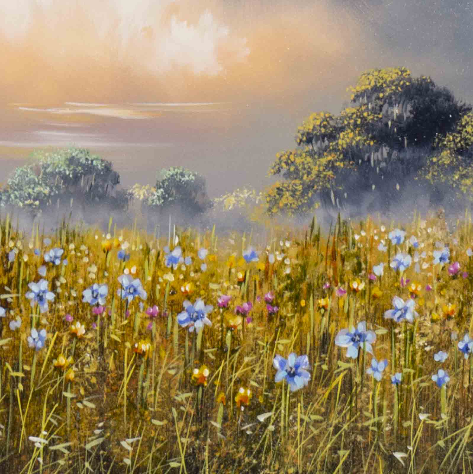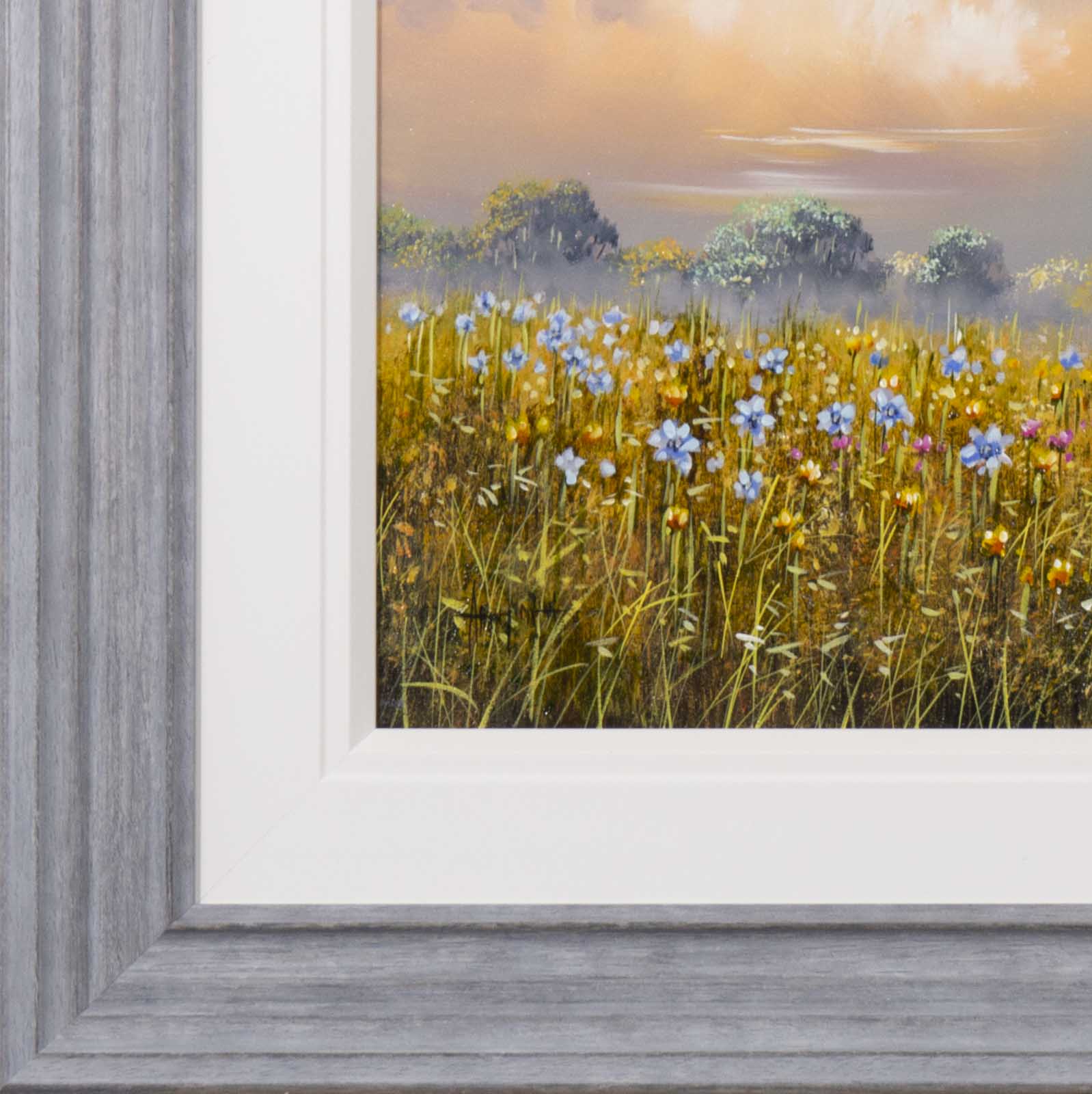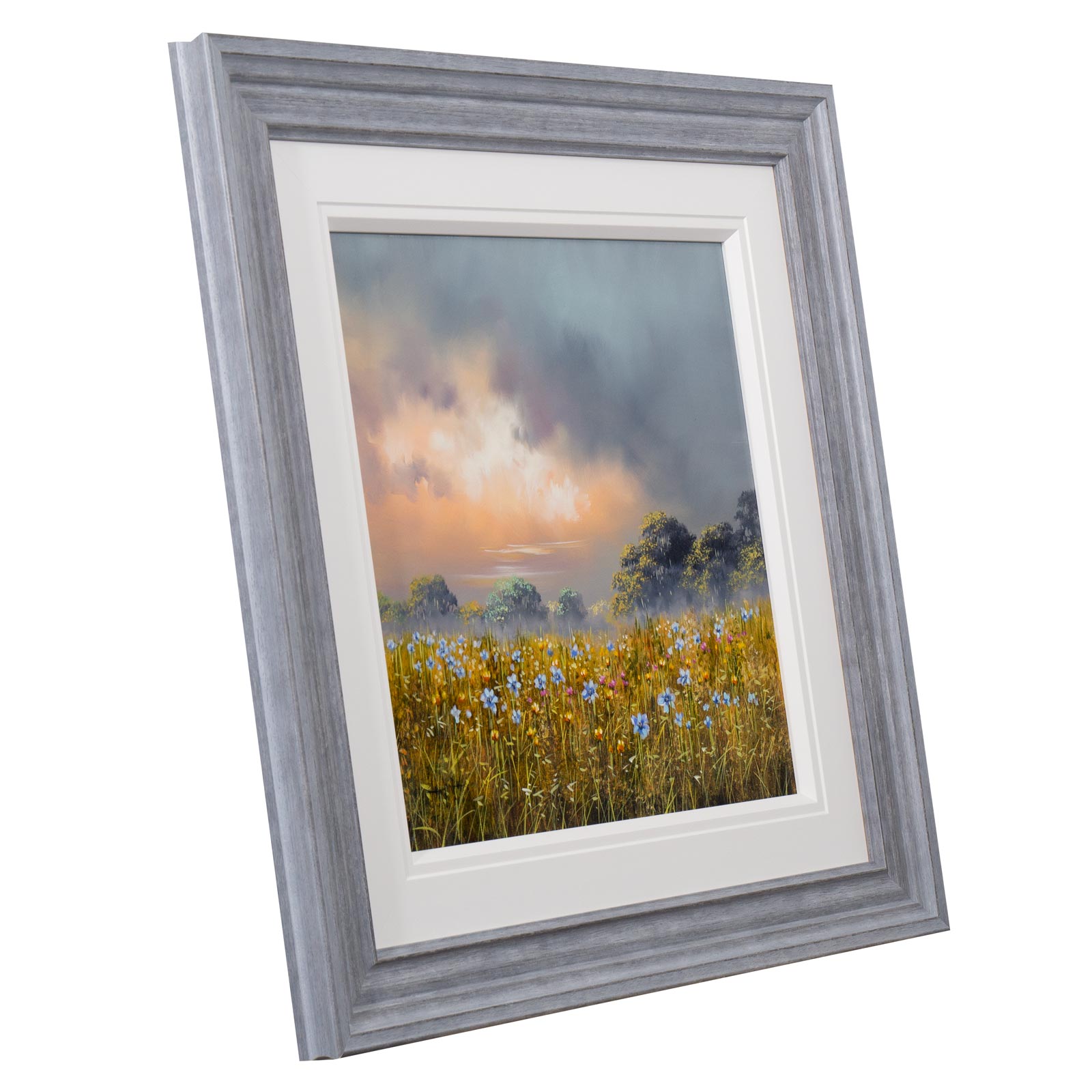 Lovely meadow landscape painting by celebrated British artist Allan Morgan. Complemented by a wide white slip and grey/blue frame as shown and ready to display on your wall.