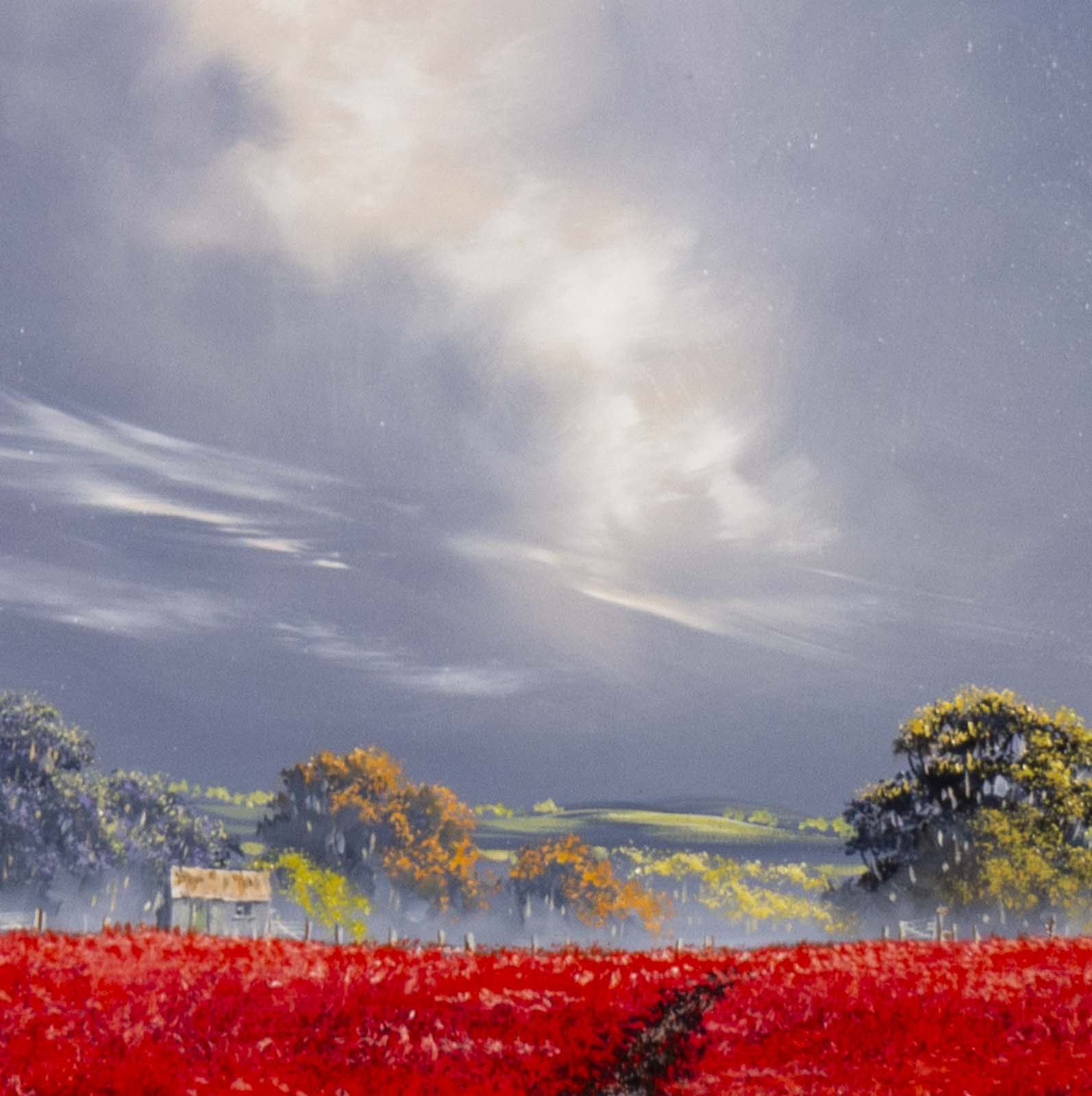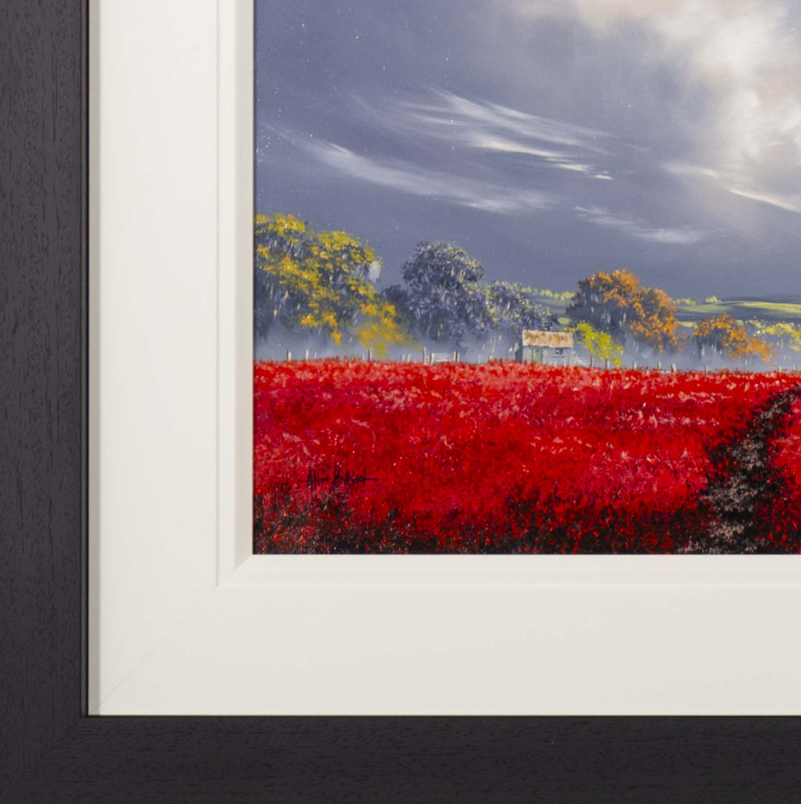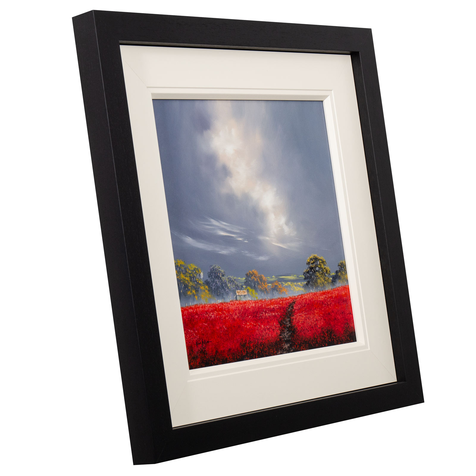 Original oil painting by Allan Morgan. A burst of light through the clouds give this atmospheric painting a sense of drama. Framed with a wide white slip and black frame, this painting is ready to display on your wall.
