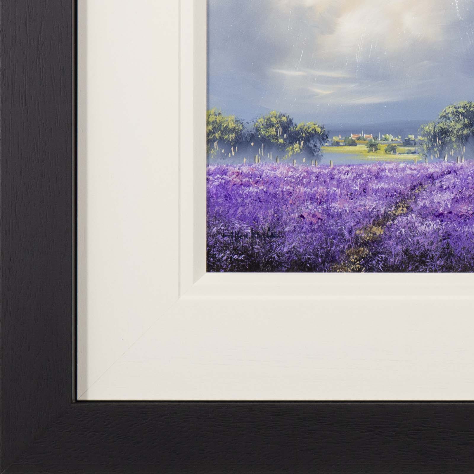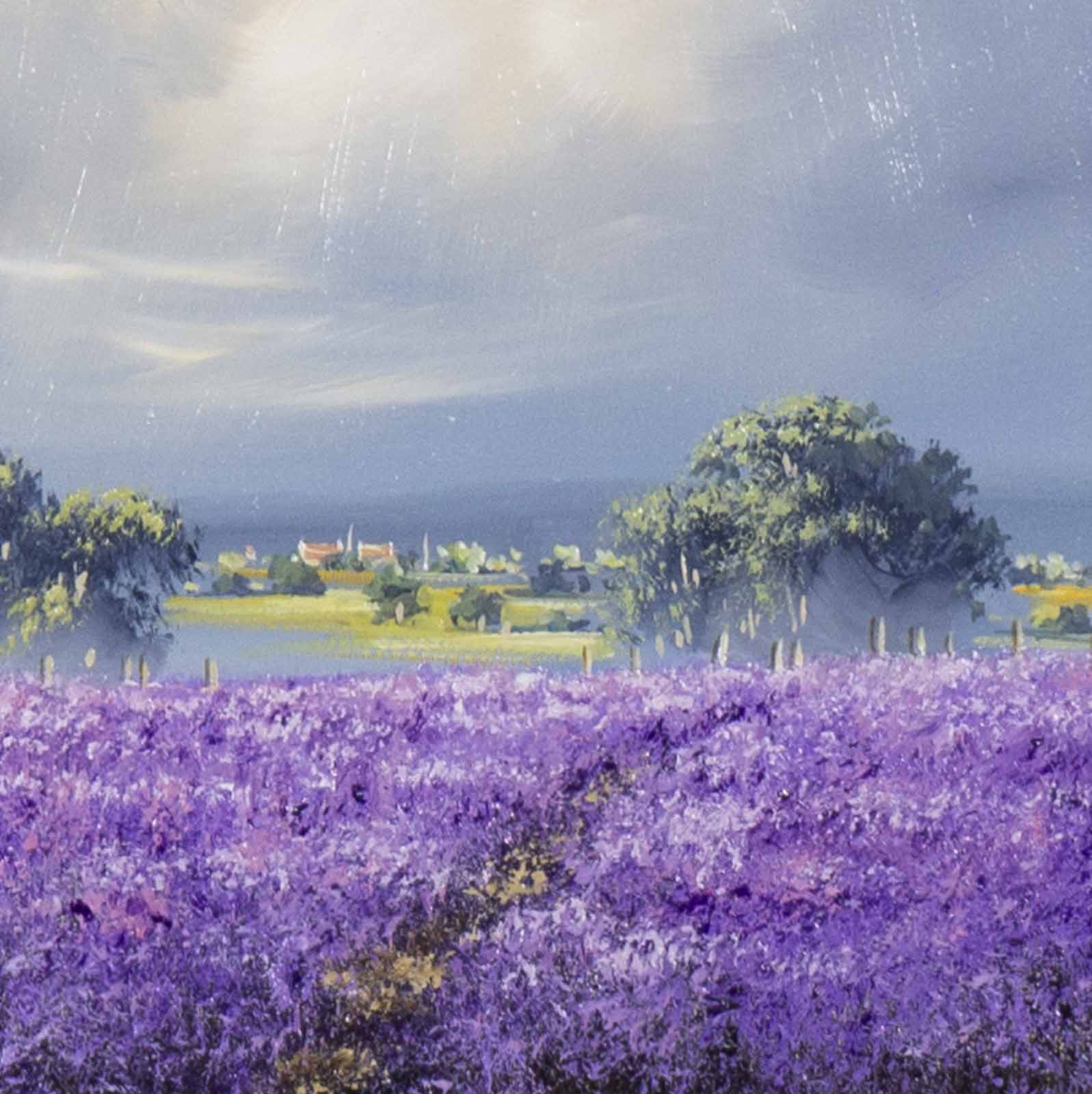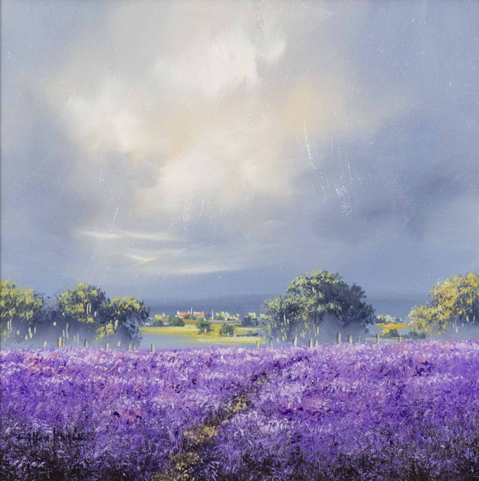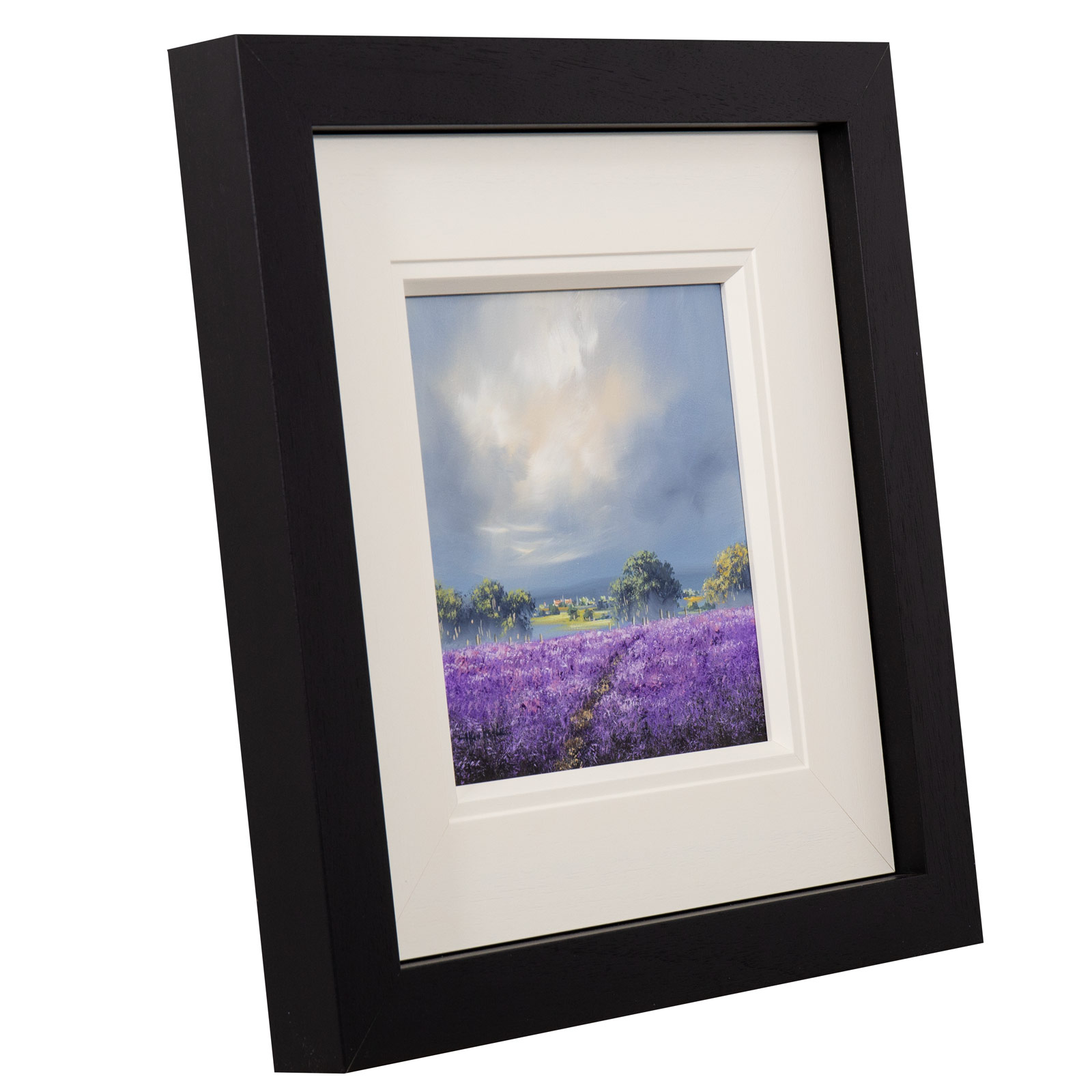 Small original oil painting by Allan Morgan. A burst of light through the clouds give this atmospheric painting a sense of drama. Framed with a wide white slip and black frame, this painting is ready to display on your wall.