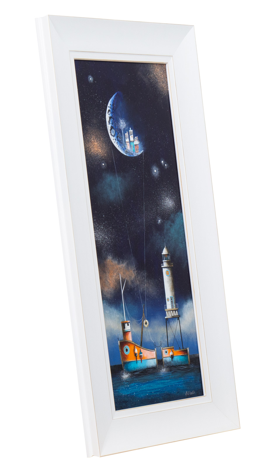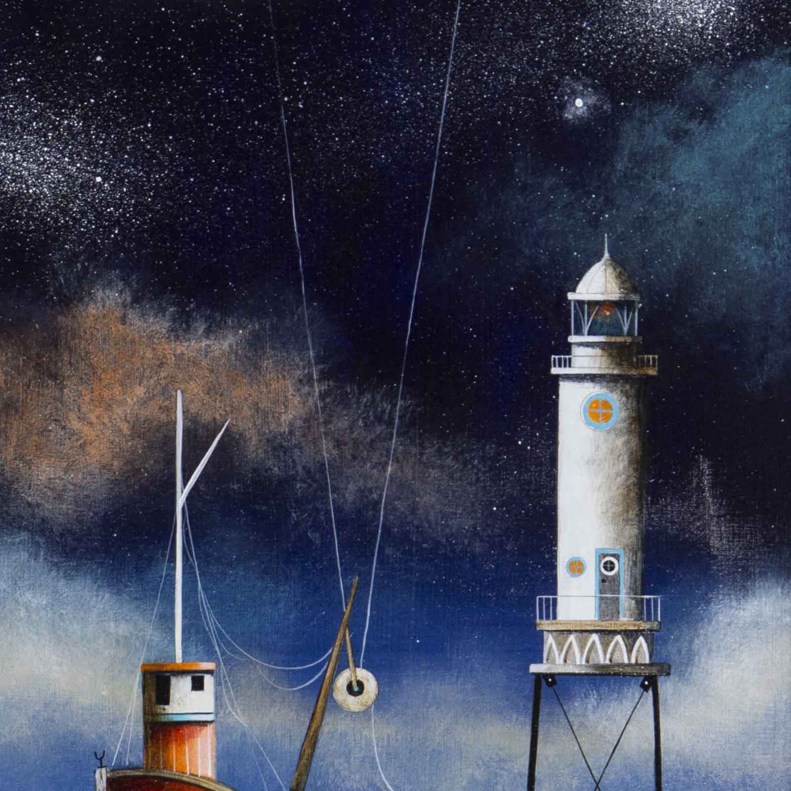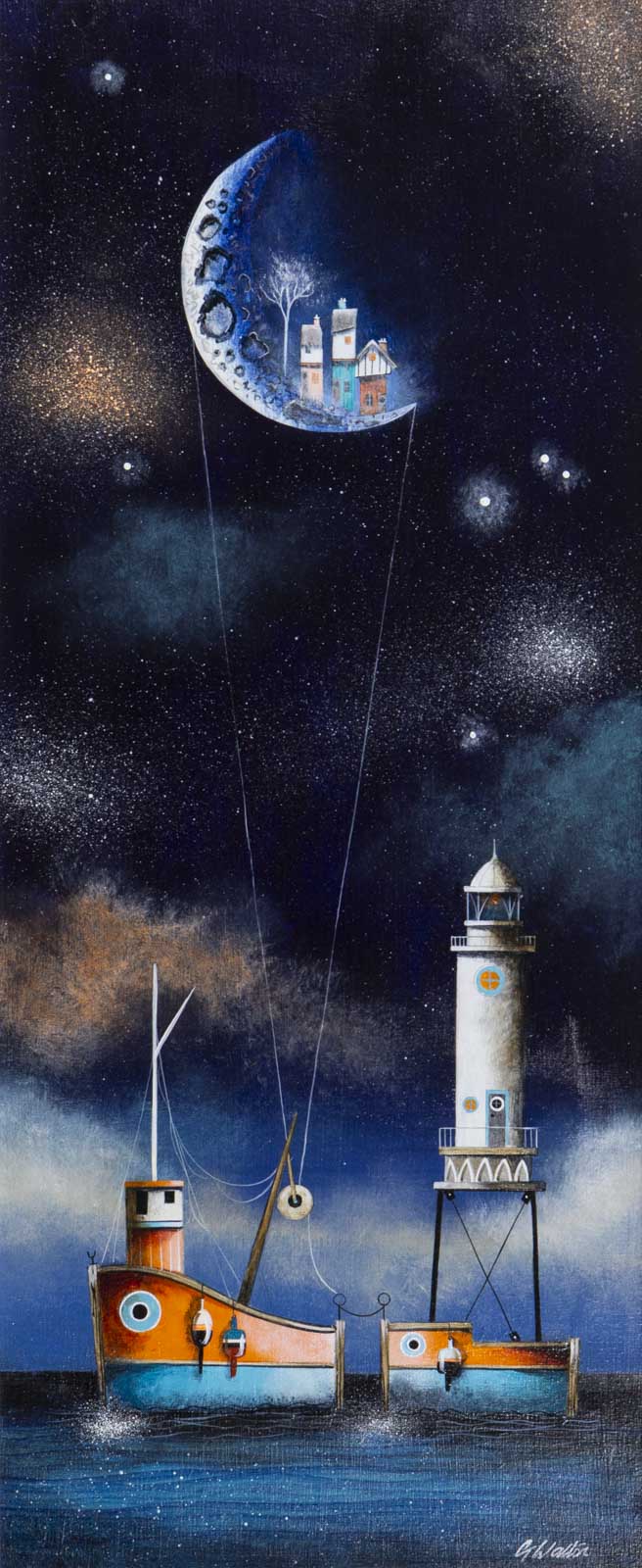 Despite having resided inland over recent years, Gary still has a strong affection for the coast. This is no more evident than in his artwork, with boats, beach huts and lighthouses providing a staple recurring motif. Whimsical buildings inhabit the rolling hills of his landscapes, providing both the audience and artist with a means to escape to his fantastical locations.