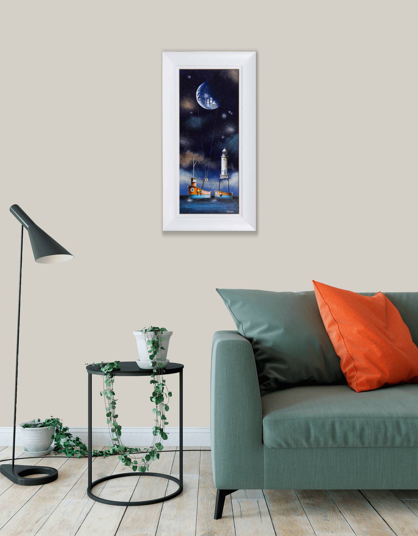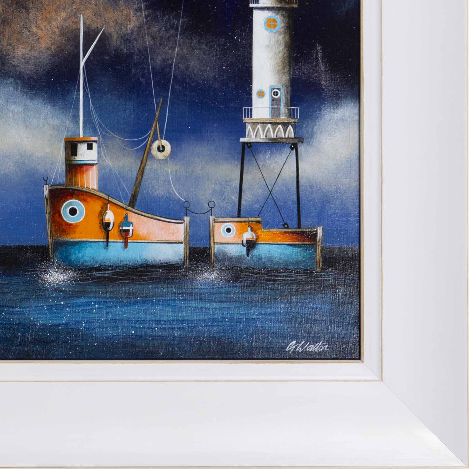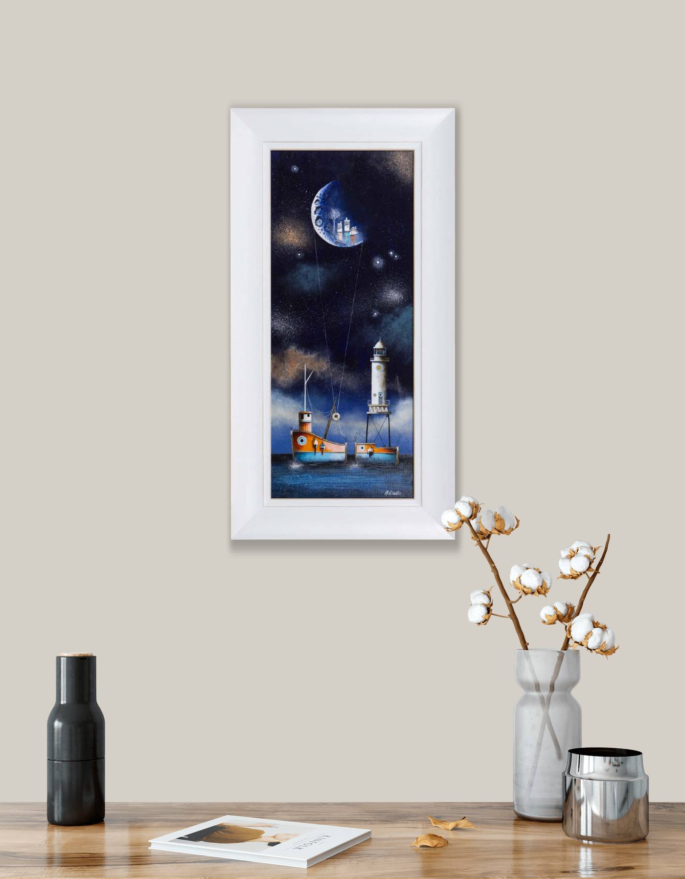 Despite having resided inland over recent years, Gary still has a strong affection for the coast. This is no more evident than in his artwork, with boats, beach huts and lighthouses providing a staple recurring motif. Whimsical buildings inhabit the rolling hills of his landscapes, providing both the audience and artist with a means to escape to his fantastical locations.
