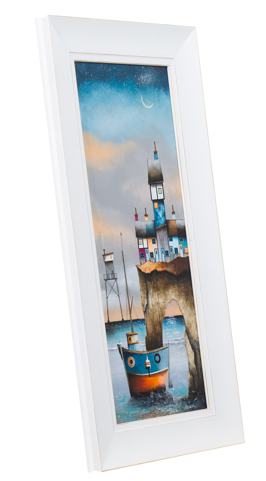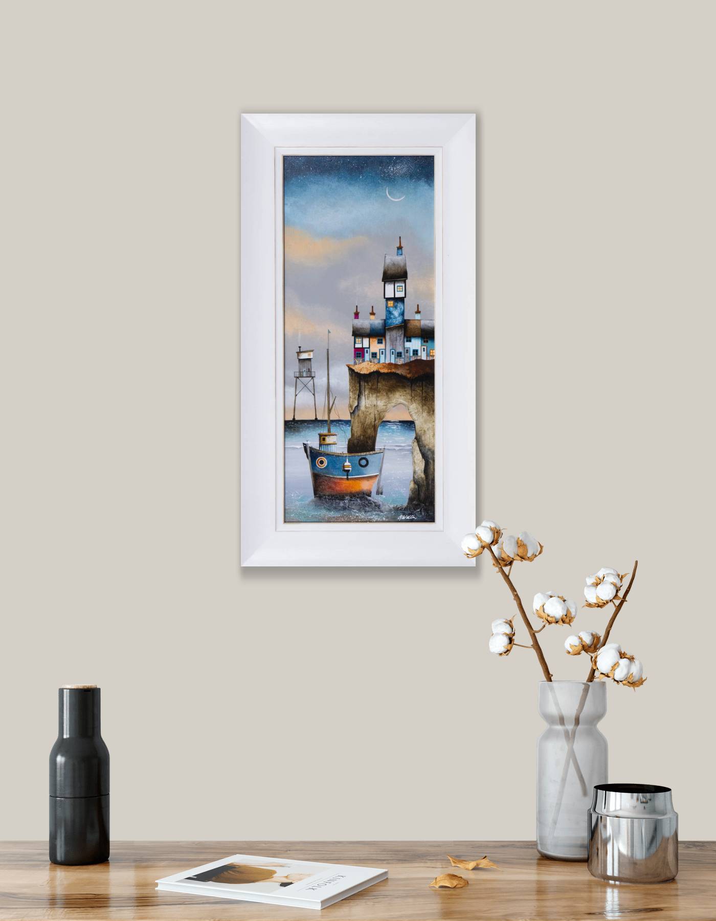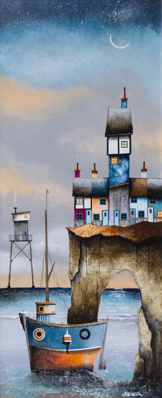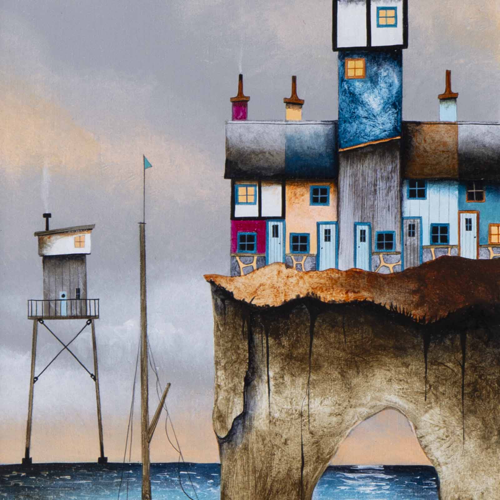 Despite having resided inland over recent years, Gary still has a strong affection for the coast. This is no more evident than in his artwork, with boats, beach huts and lighthouses providing a staple recurring motif. Whimsical buildings inhabit the rolling hills of his landscapes, providing both the audience and artist with a means to escape to his fantastical locations.