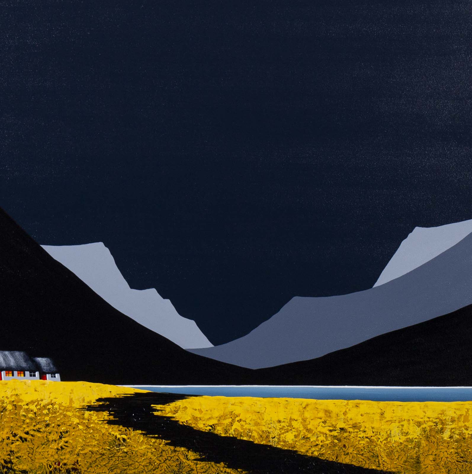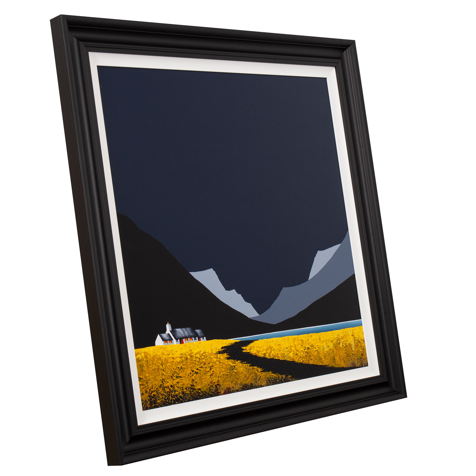 A large original painting by Jay Nottingham with a heavily textured foreground and his signature cottage. Framed with a white slip and matt black frame as shown and ready to hang.