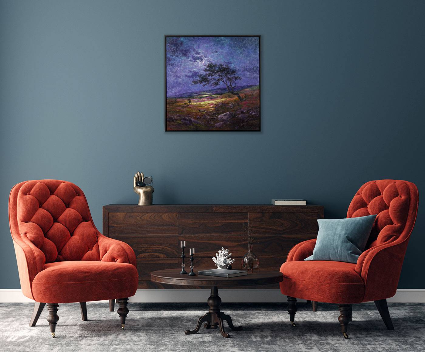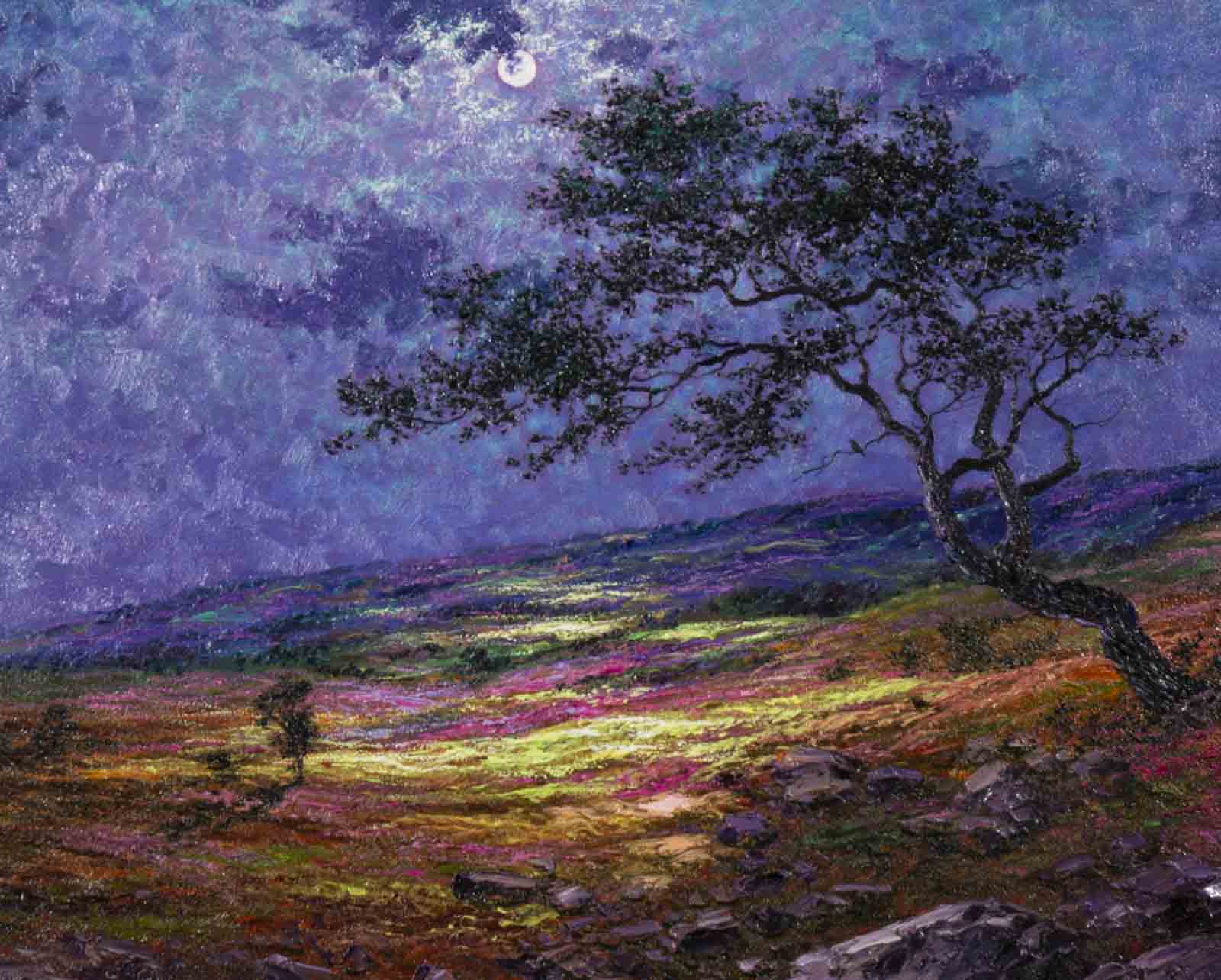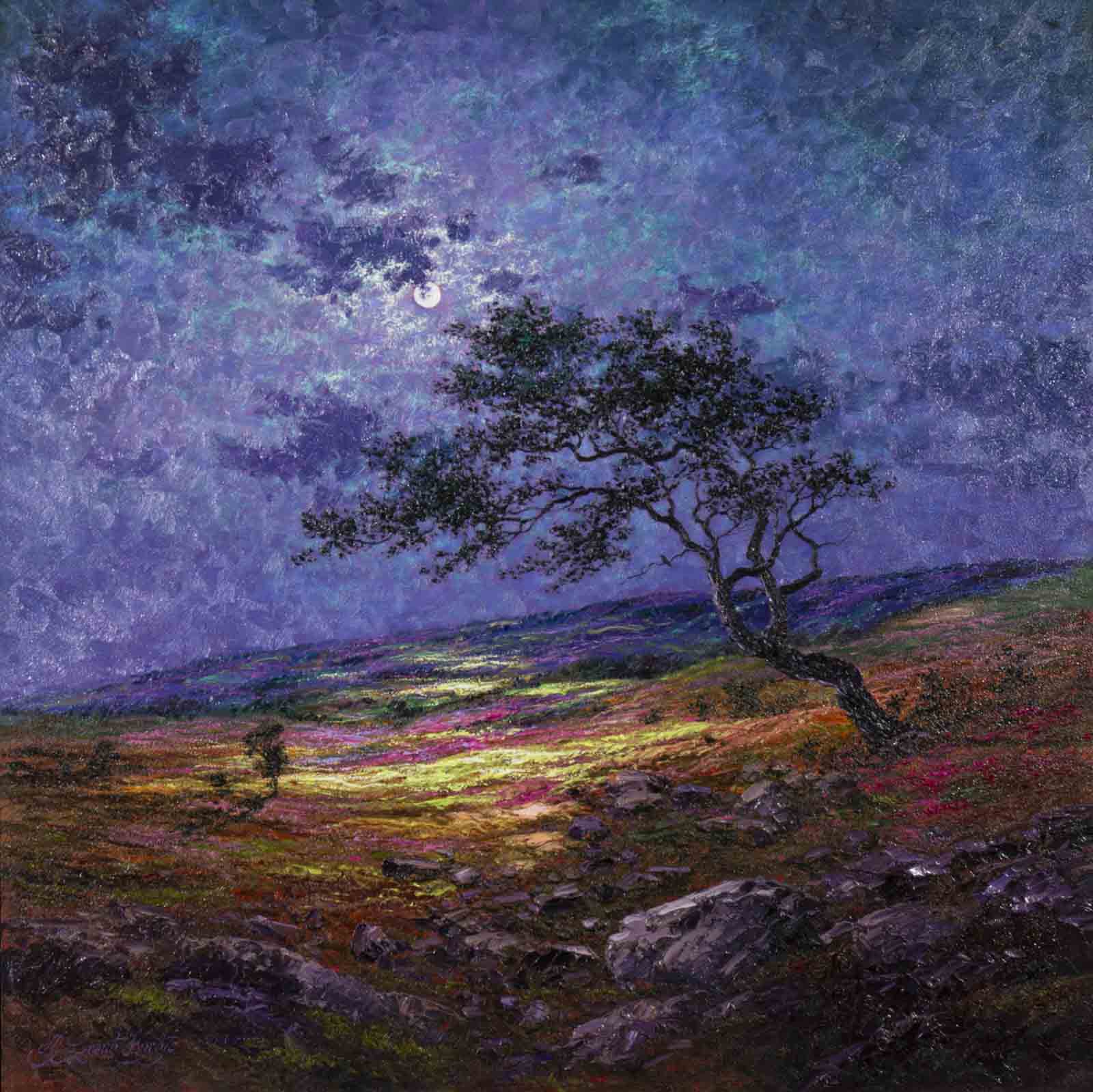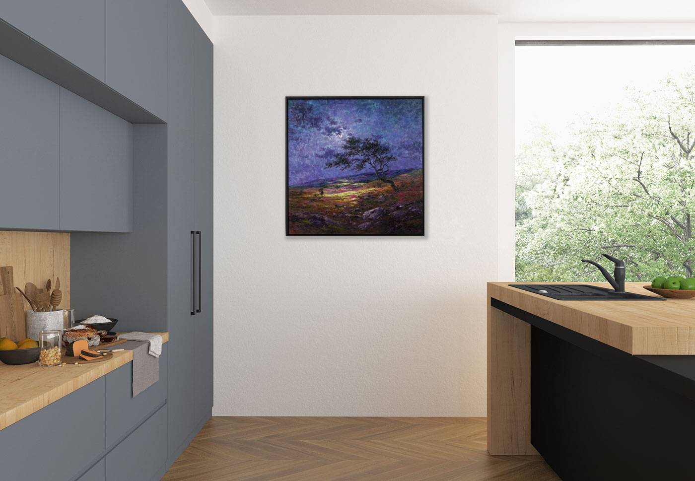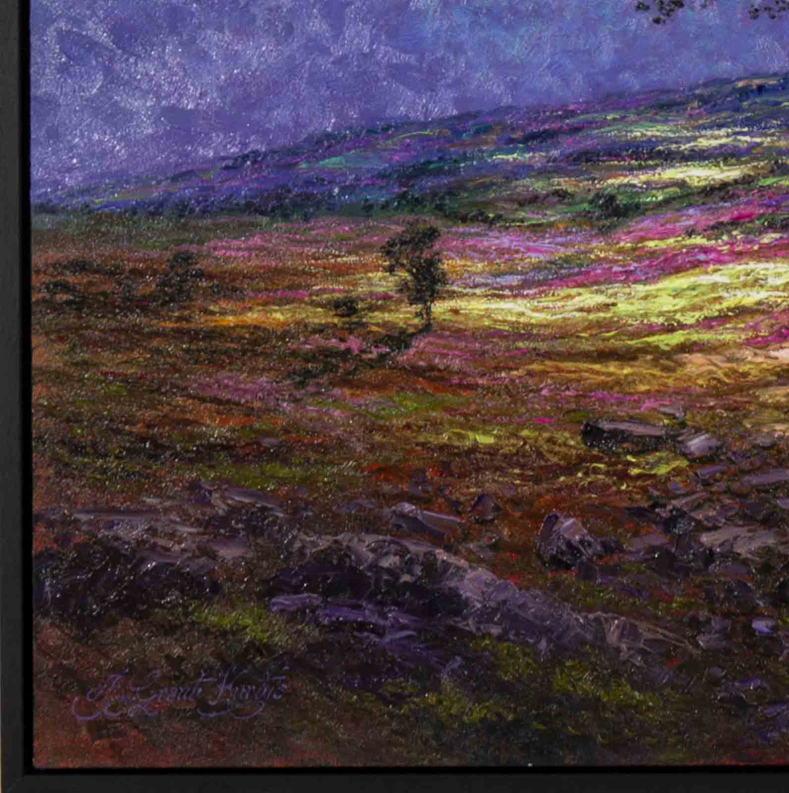 Gorgeous representation of Rosedale at night by Andrew Grant Kurtis. Rosedale is a valley located in the centre of the North York Moors national park in North Yorkshire, England. This original oil painting is presented framed in a contemporary black float frame as shown and ready to hang.
