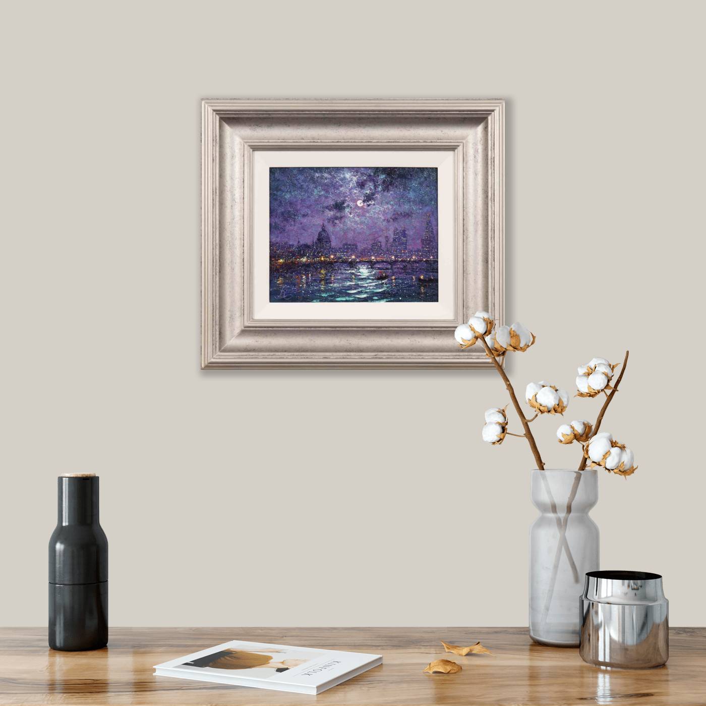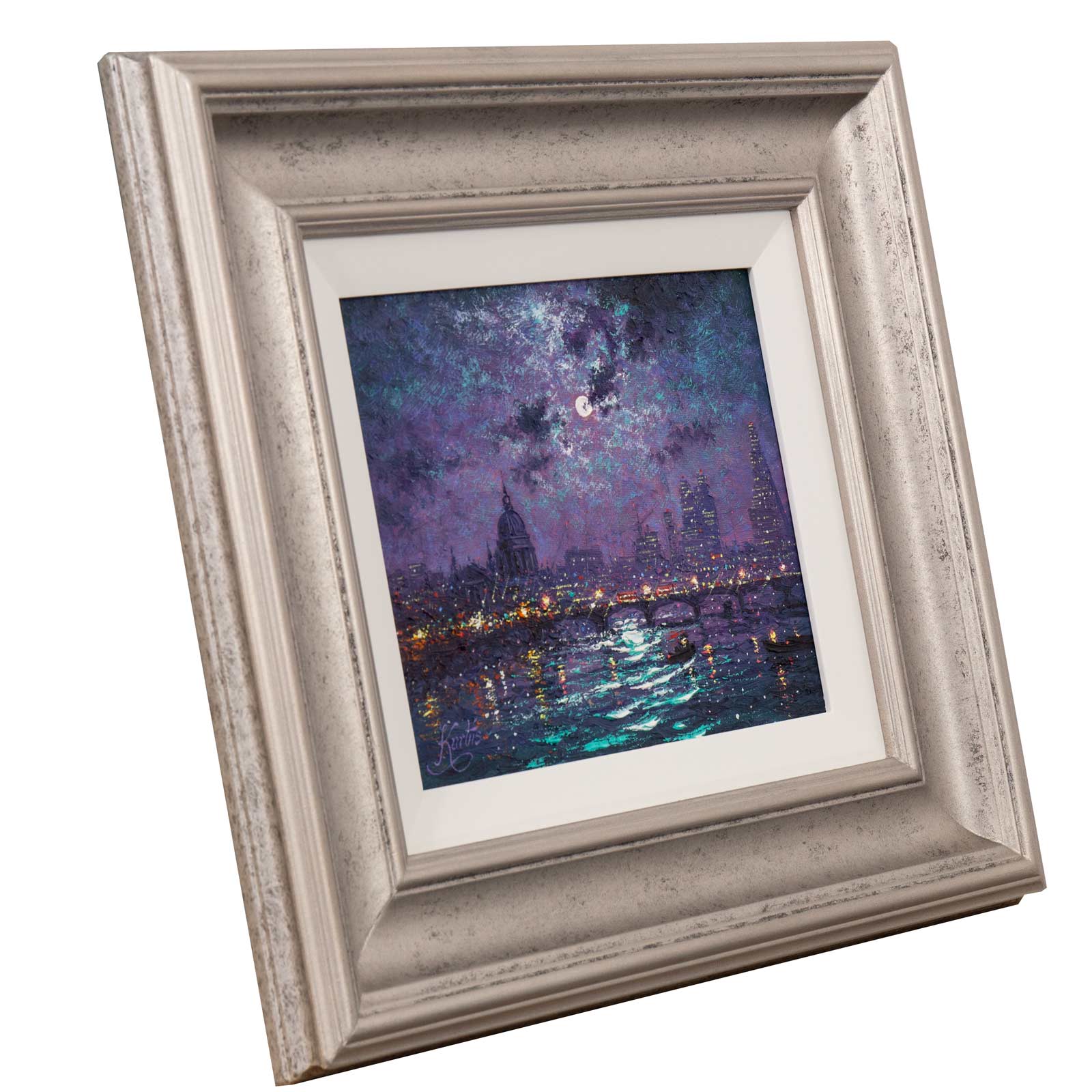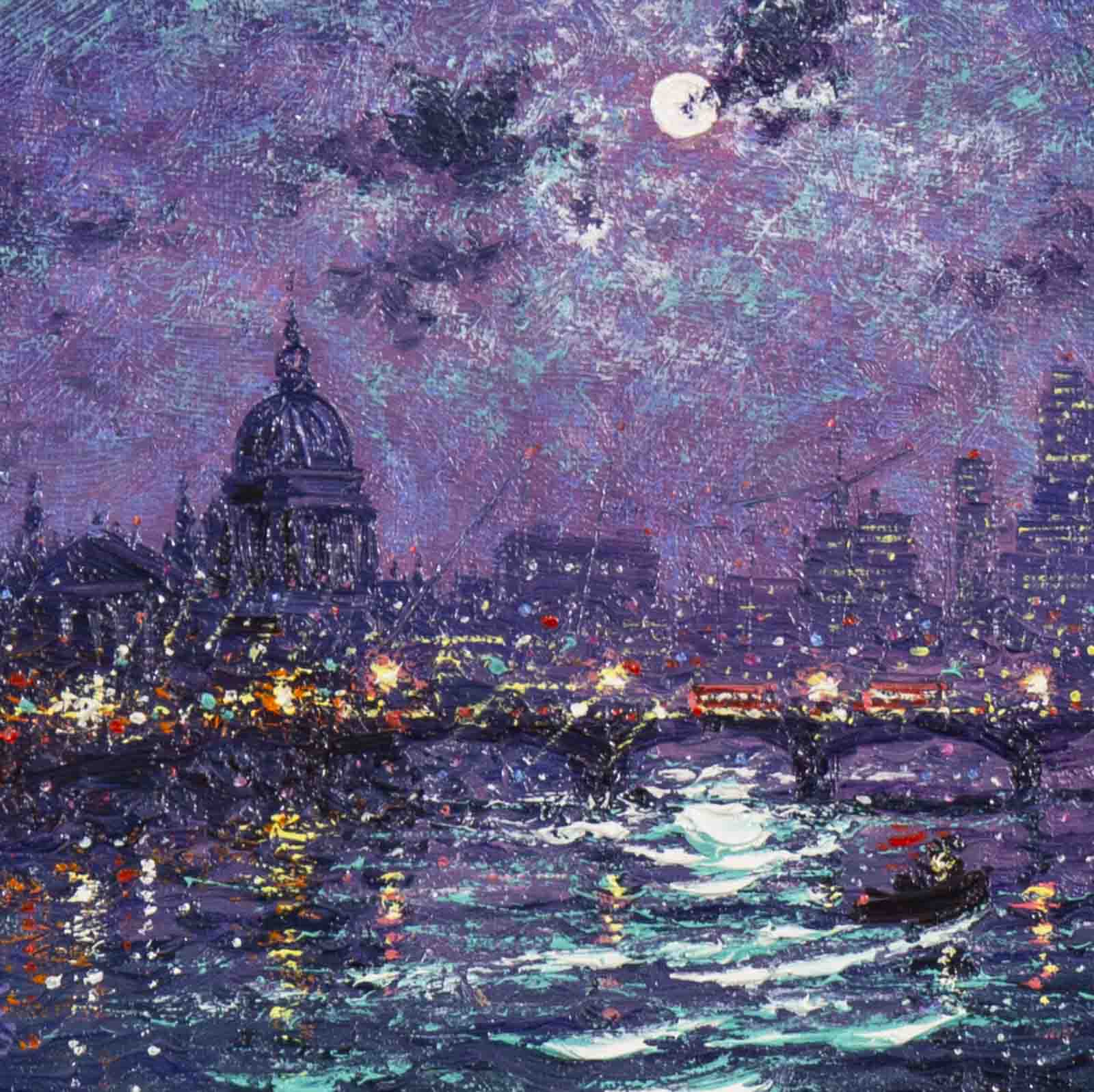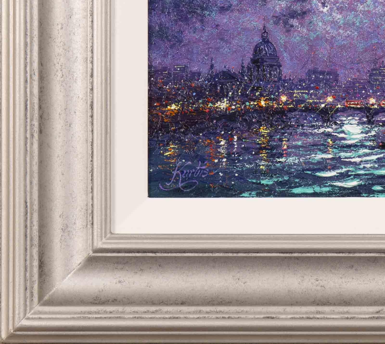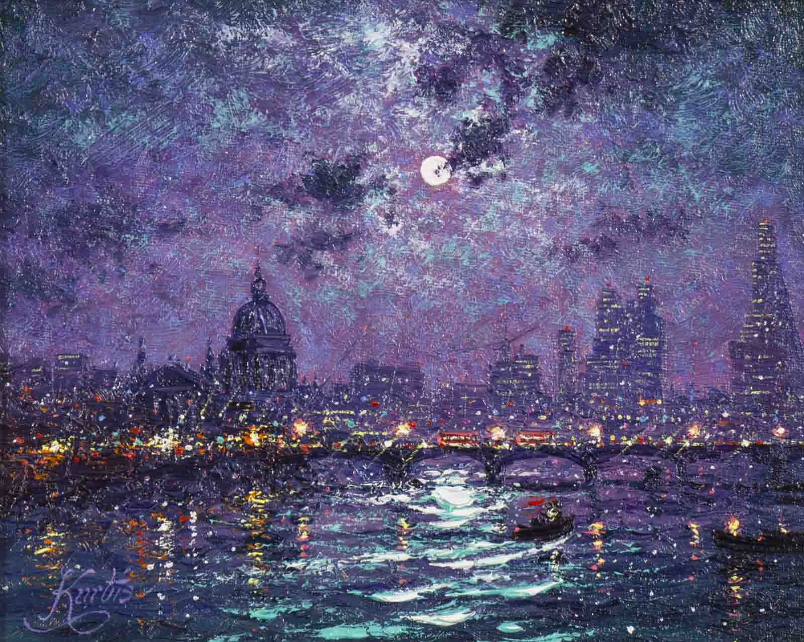 Gorgeous representation of London at night by Andrew Grant Kurtis. This original oil painting is presented framed with a white slip and silver moulding as shown and ready to hang.