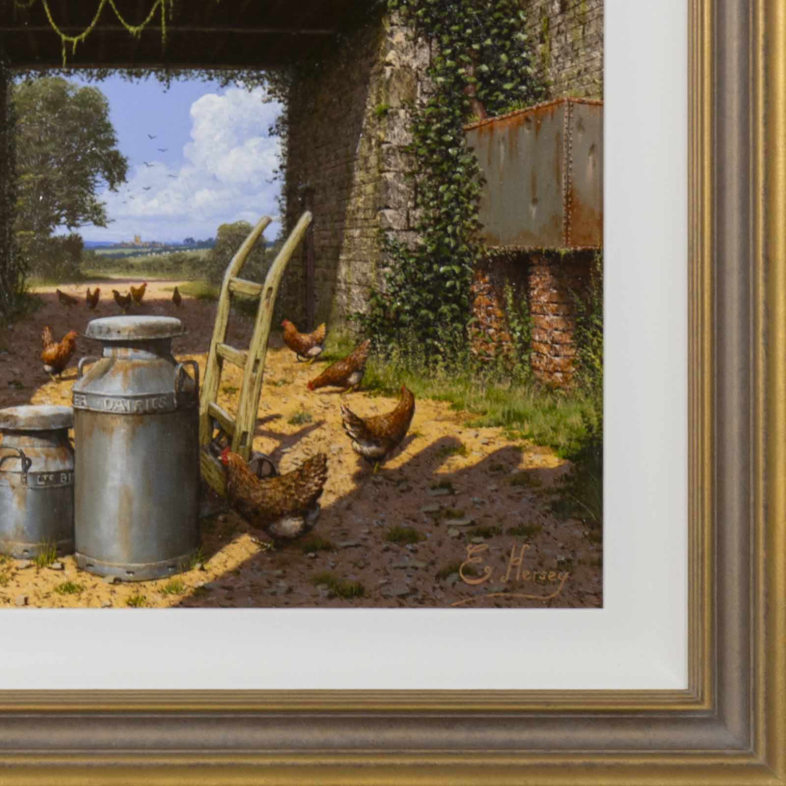 Incredible detail envelops this masterful large original oil painting by British artist Edward Hersey. Presented framed in a white slip and bronze finish frame as shown and ready to hang.