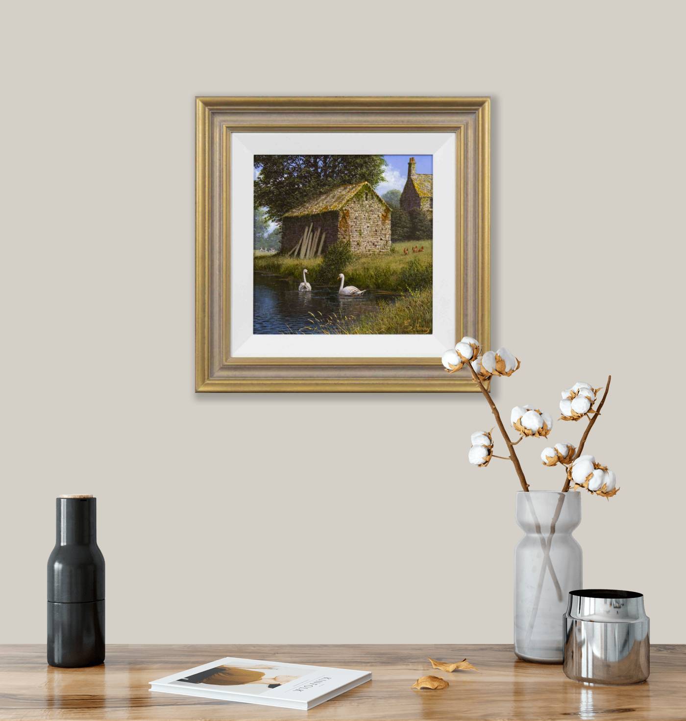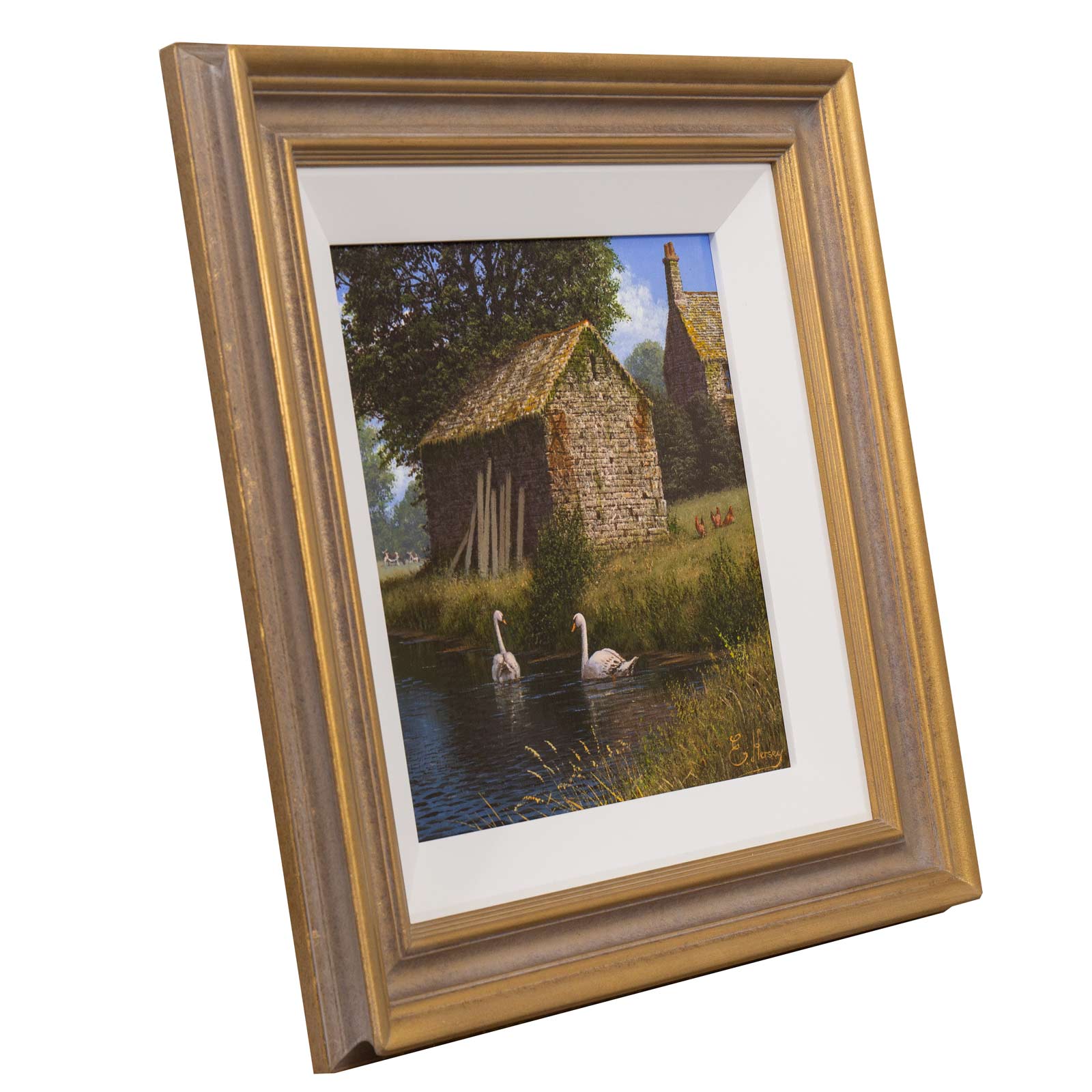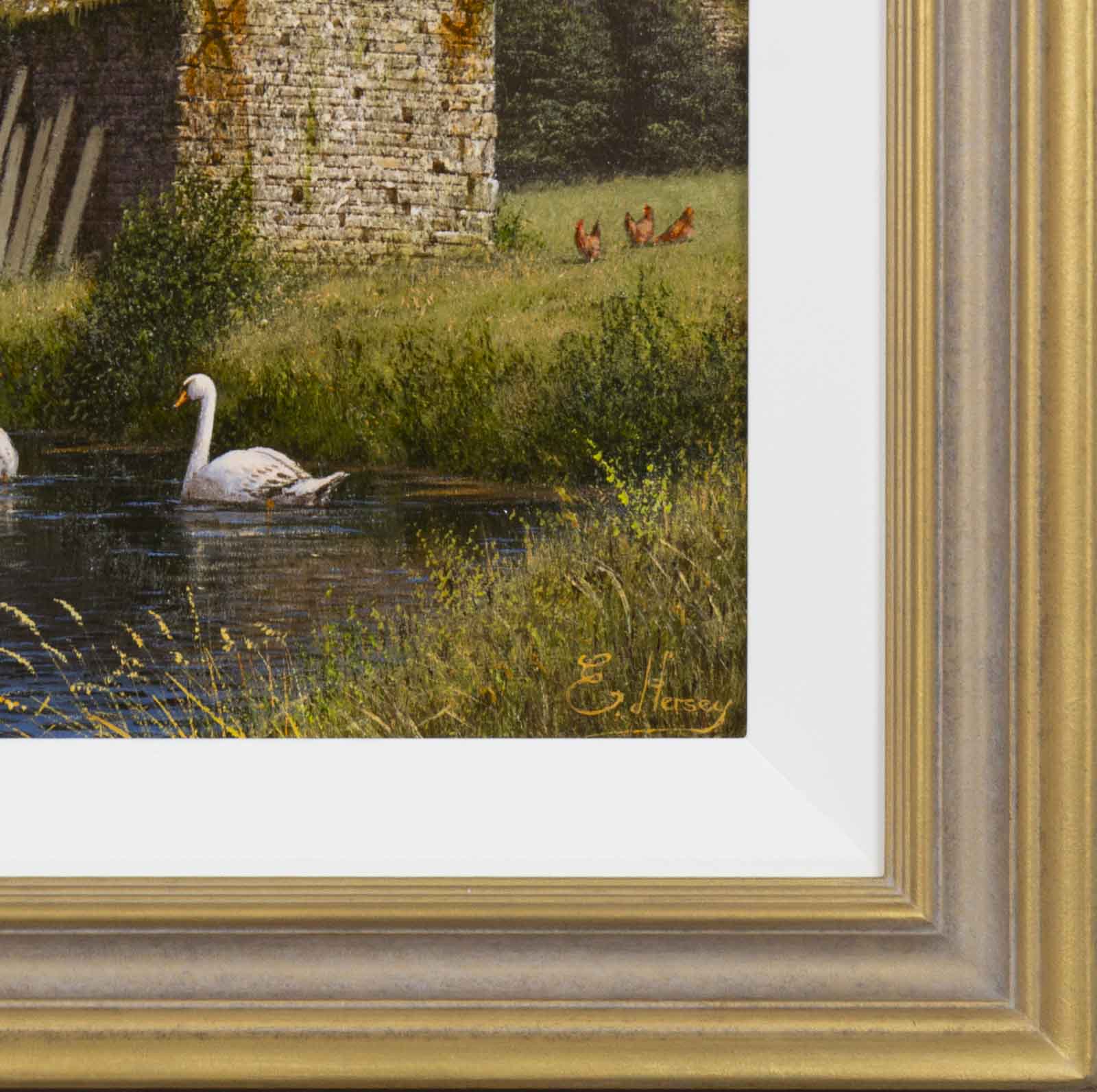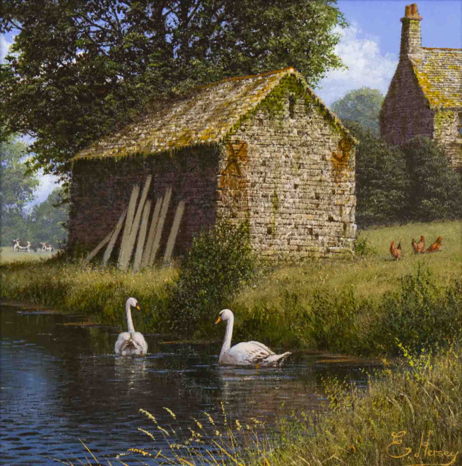 Farm life encapsulated beautifully in this original oil painting by British artist Edward Hersey. Presented framed in a white slip and bronze finish frame as shown and ready to hang.