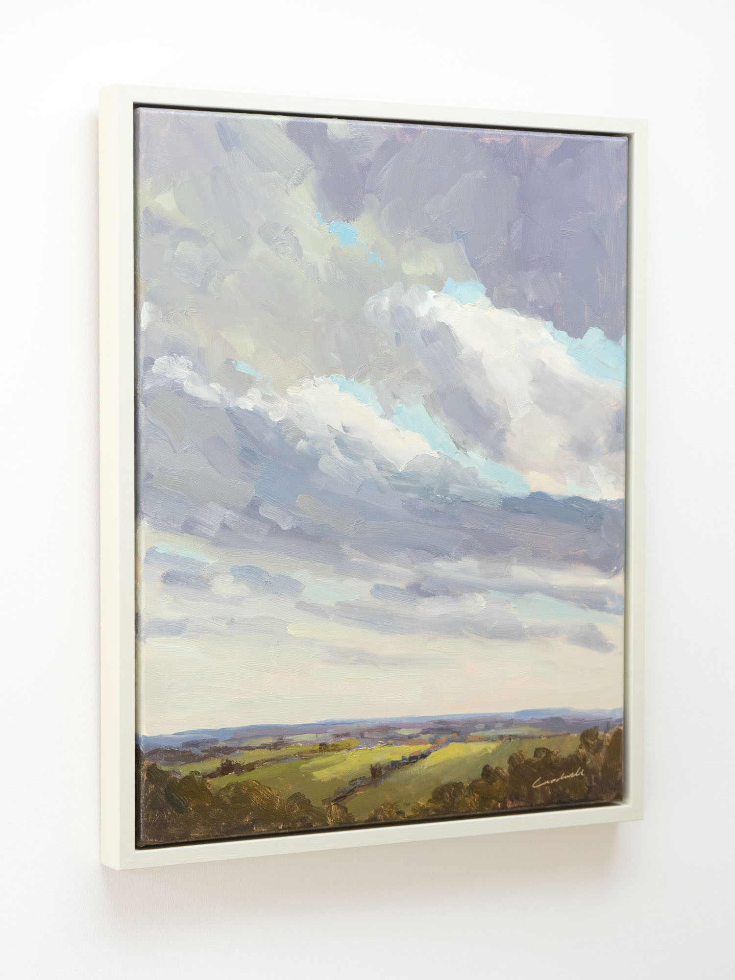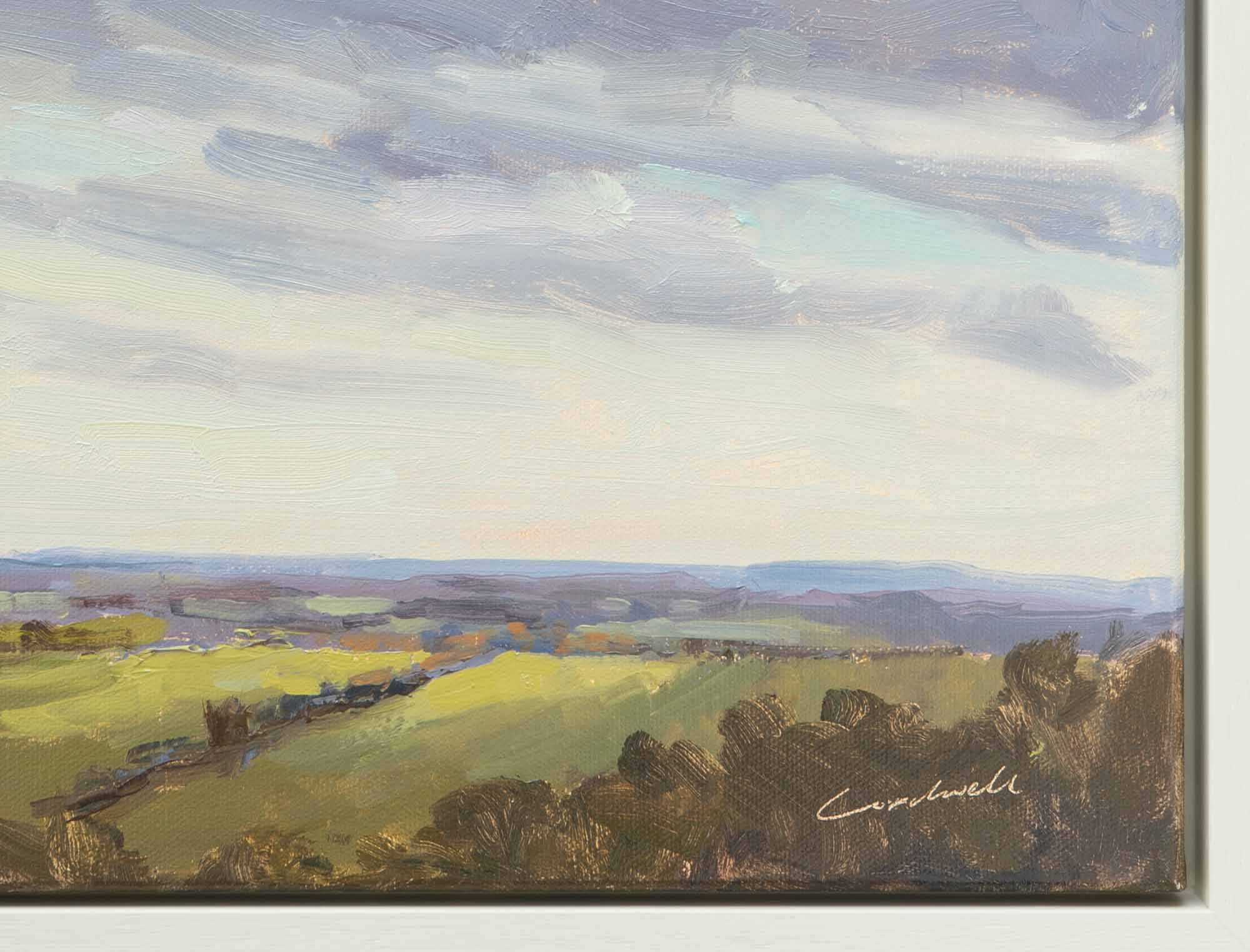 Original oil painting on canvas capturing a big vista with breaking light by British artist Matthew Cordwell. Presented in a hand painted tray frame using Farrow & Ball paints and ready to hang on the wall.